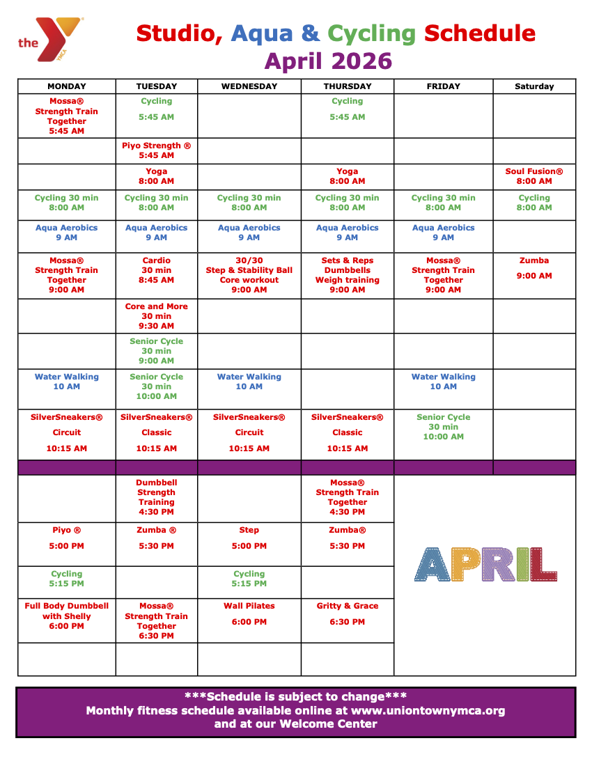 Yoga: Yoga is a mat-based class designed to increase flexibility, balance, range-of-motion, and muscle strength. Participants will be led through a series of flowing moments that transition from standing to the mat. Relaxation and restorative breathing are included.